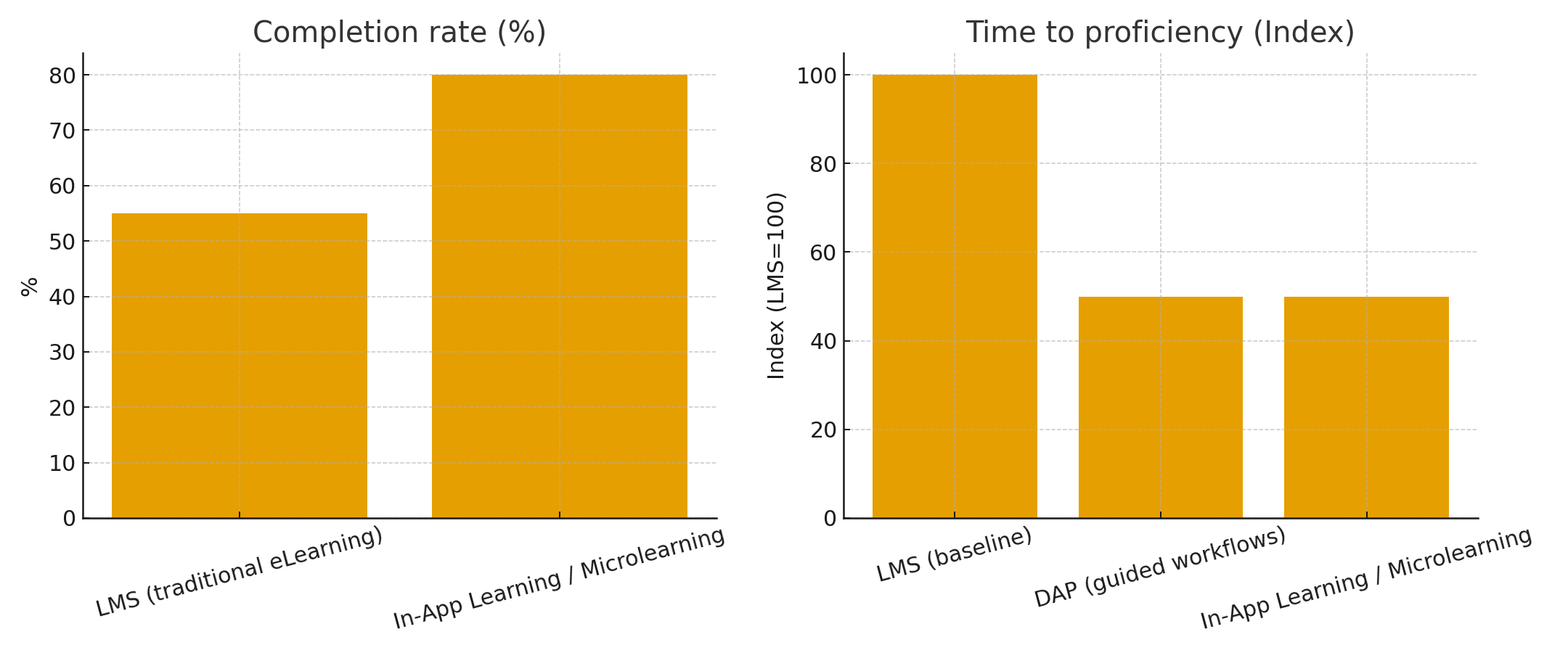 A crucial evolution in adoption strategy has been moving from traditional LMS (which require users to leave their work to complete training modules) to in-app learning. Classic DAPs fill this gap by providing guidance within the application interface. However, early DAP solutions often focused on basic walkthroughs (“click here, then there”) and lacked deeper educational content for true skill-building. The latest wave of adoption platforms is combining the best of both worlds: integrating richer training content and resources directly inside the software. This means users not only get tooltips, but also can access tutorials, videos, or even interactive exercises on advanced use-cases without ever switching windows. The result is dramatically reduced friction and faster proficiency gains. Users get the help they need at the exact moment of need, and using the new tool becomes almost second-nature over time. (For a detailed breakdown of traditional LMS vs. DAP vs. next-gen in-app training, see our DAP vs LMS comparison guide.)
